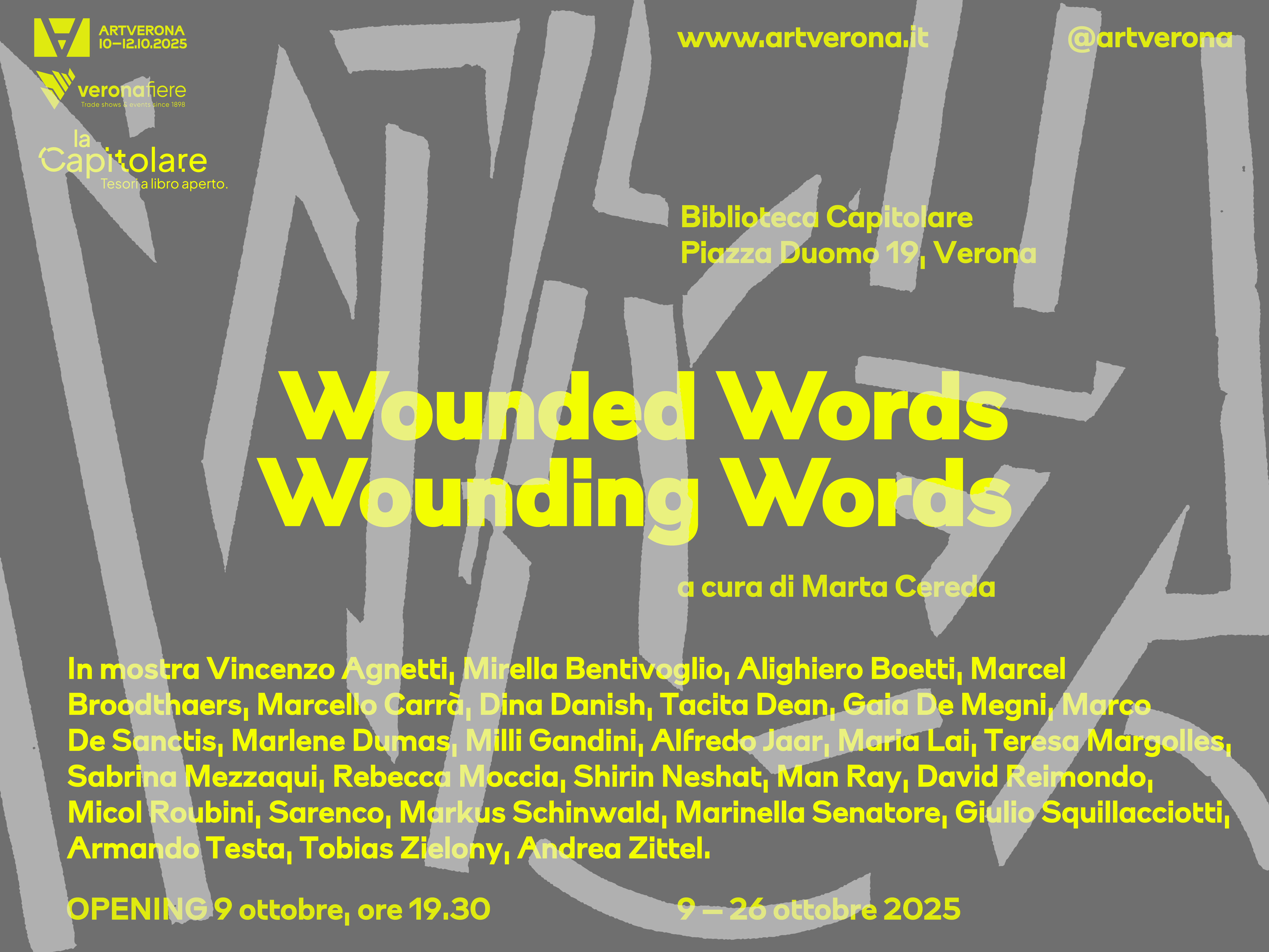 As part of the 20th edition of ArtVerona, from 9 to 26 October, we will host the exhibition Wounded Words Wounding Words, curated by Marta Cereda.
